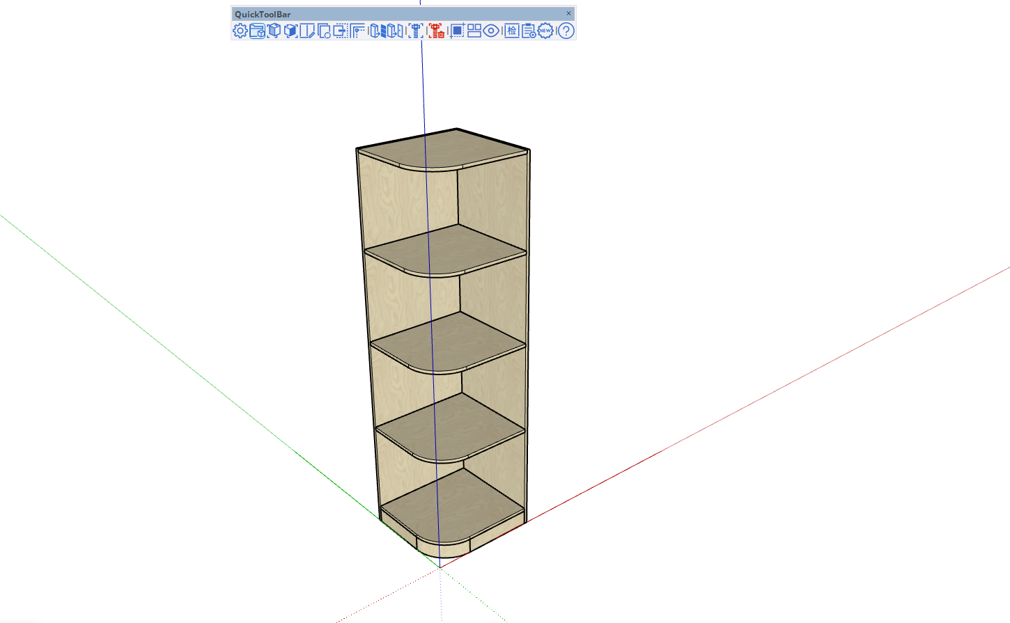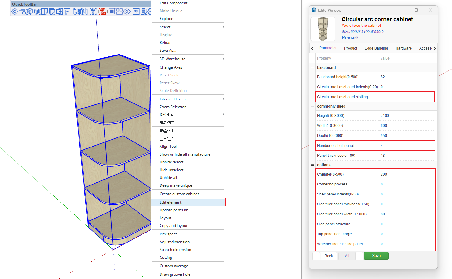 This arc corner cabinet supports both left and right corners. The number of shelves can be set, and grooving can be enabled or disabled.
