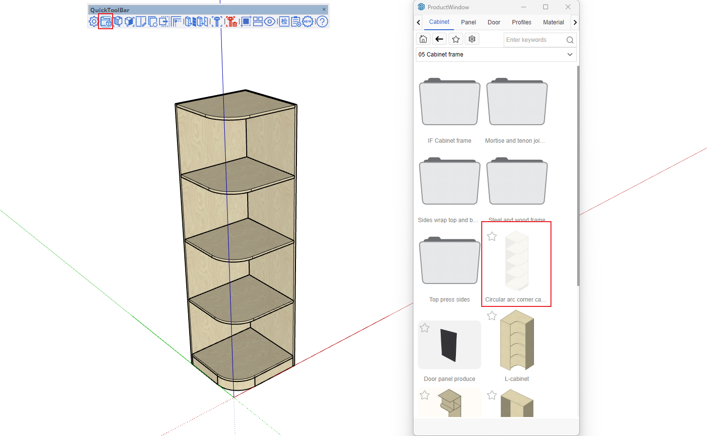 - Directly call the arc corner cabinet (activate the "Pick Internal Space" function and use code 203, or search for "arc corner cabinet" in the Product Library)