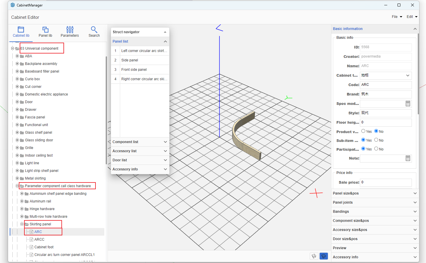 The Zhumu Furniture Design System supports automatic report generation and production of arc toe kicks, and can automatically groove the panels in the arc sections.